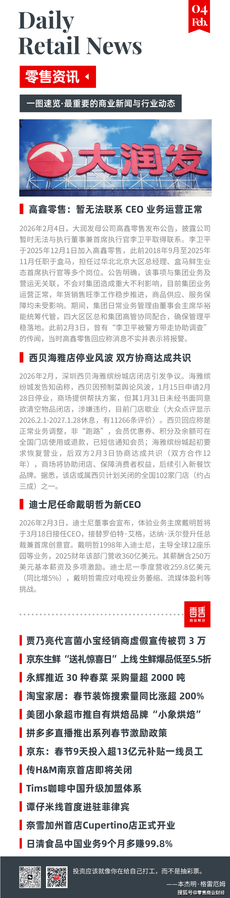 2026年2月4日,大润发母公司高鑫零售发布公告,披露公司暂时无法与执行董事兼首席执行官李卫平取得联系。李卫平于2025年12月1日加入高鑫零售,此前2018年9月至2025年11月任职于盒马,担任过华北北京大区总经理、盒马鲜生业态首席执行官等多个岗位。公告明确,该事项与集团业务及营运无关联,不会对集团造成重大不利影响,目前集团业务运营正常,年货销售旺季工作稳步推进,商品供应、服务保障均未受影响。期间,集团日常业务管理由董事会主席华裕能统筹代管,四大区区总和集团高管协同配合,确保管理平稳落地。此前2月3日,曾有“李卫平被警方带走协助调查”的传闻,当时高鑫零售回应称消息不实并表示将报警。