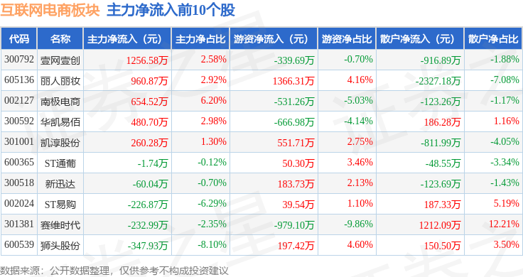 从资金流向上来看,当日互联网电商板块主力资金净流出1.08亿元,游资资金净流出419.62万元,散户资金净流入1.12亿元。互联网电商板块个股资金流向见下表: