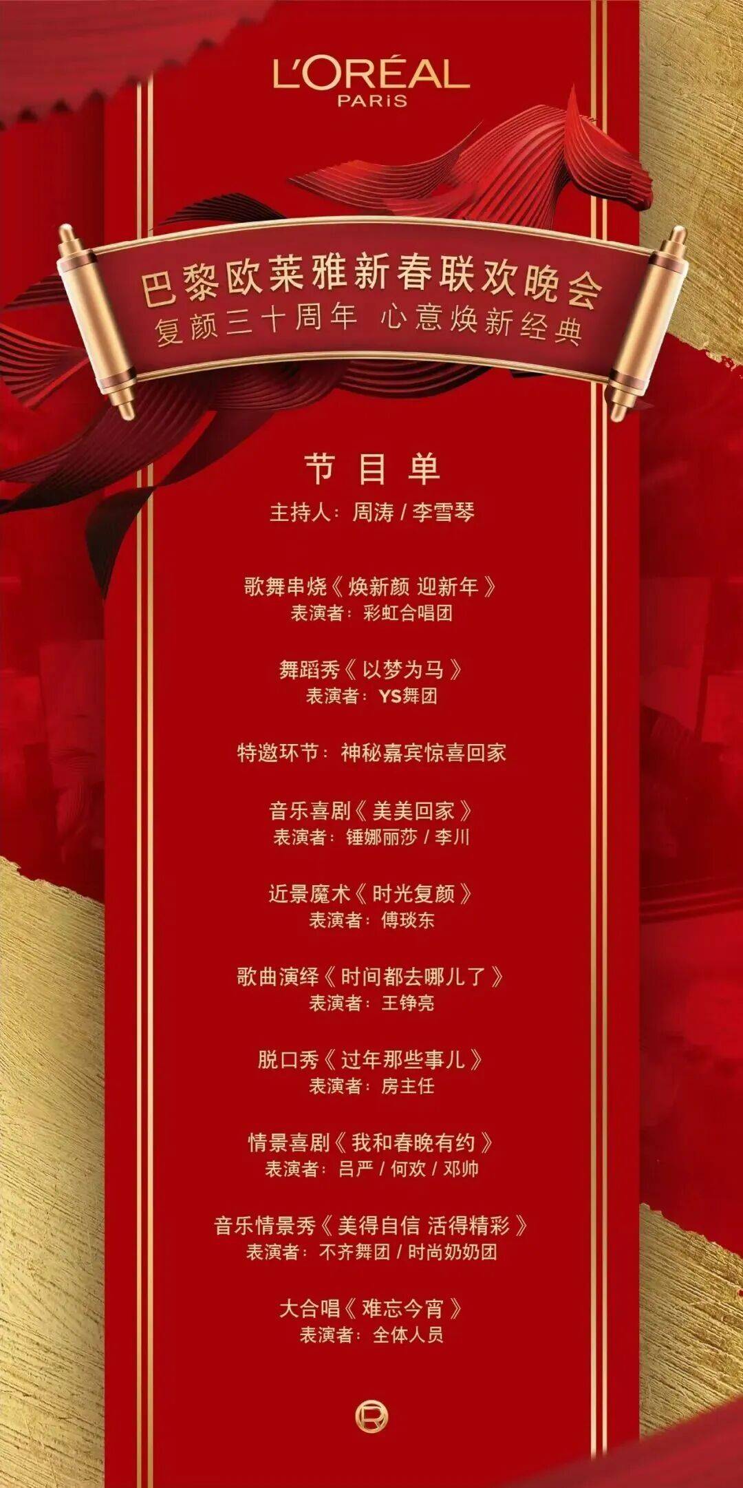 2月4日, 巴黎欧莱雅举办三十周年新春联欢晚会,邀请著名主持人周涛以及众多明星出席,在天猫、京东、抖音、微博、视频号等线上平台直播。