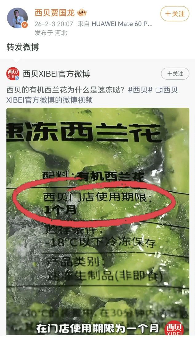 2月4日消息, 西贝餐饮集团创始人贾国龙的微博账号“西贝贾国龙”于昨日解禁。其解禁后的第一条内容是“西贝有机西兰花为什么是速冻”的科普视频。该视频转发自“西贝XIBEI”官方微博。