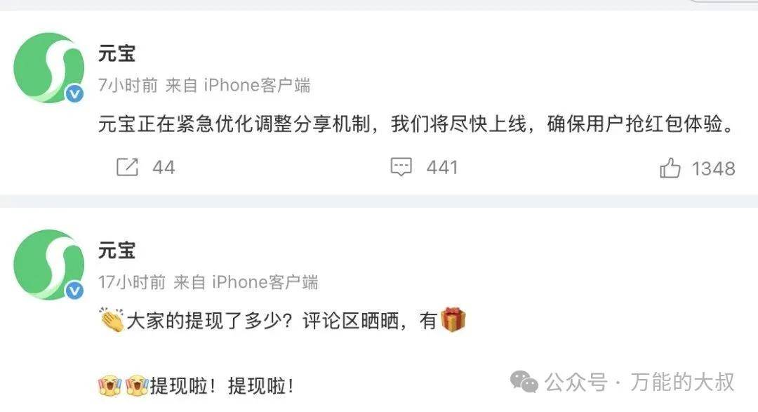 “元宝正在紧急优化调整分享机制,我们将尽快上线,确保用户抢红包体验。”
