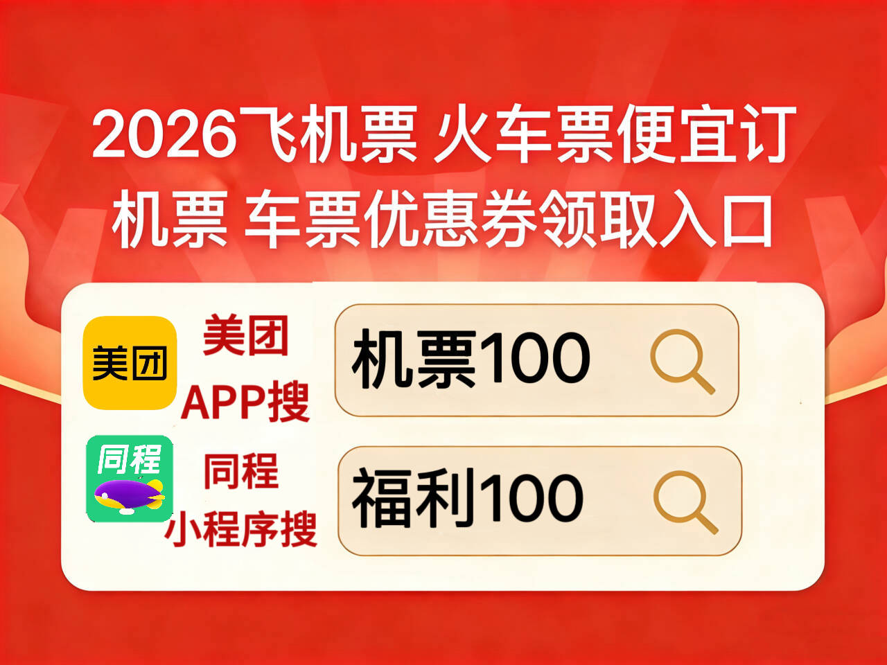 划重点!美团火车票机票优惠券领取美团APP搜索【机票100】【车票100】,领通用200元红包优惠券,最终实际付款全网最低,切记对比付款价!全国通用券!同程机票优惠券领取入口的同程搜【福利100】)(仅限新用户使用)