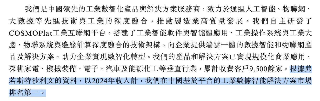 公司的产品和解决方案已实现规模化商业应用,深耕家电、机械装备、电子、汽车及能源化工等垂直行业,累计收费客户9,500余家。根据弗若斯特沙利文的资料,以2024年收入计,卡奥斯在中国基于平台的工业数据智能解决方案市场排名第一。