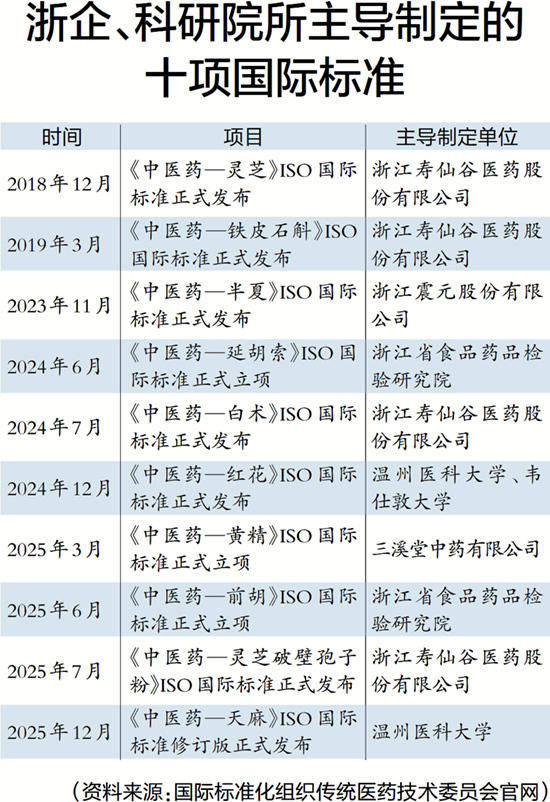 不久前,温州医科大学中医药学院熊吟副教授主导修订的新版《中医药-天麻》ISO国际标准正式发布实施;2025年7月,浙江寿仙谷医药股份有限公司主导制定的《中医药-灵芝破壁孢子粉》ISO国际标准正式发布;2025年6月,浙江省食品药品检验研究院主导制定的《中医药-前胡》ISO国际标准正式立项……浙江制定的中医药ISO国际标准数量,在全国各省位居前列。