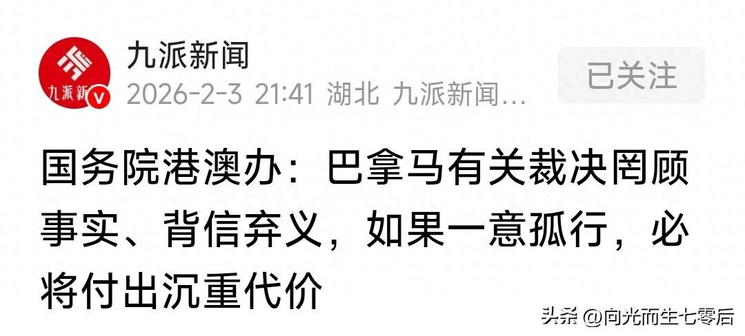 2026年2月3日,国务院港澳办发表了一篇名为《巴拿马自我打脸自食恶果》的文章。三天前,1月31日,香港《大公报》因巴拿马当地时间29日作出的一个屁股坐歪的决定,深感愤怒,并发表了题为《巴拿马司法献媚,必将自食其果》的评论文章。巴拿马当局的这一决定,撤销了香港长江和记集团两大港口的合法运营合同。《大公报》痛斥巴拿马司法机关为了讨好某些强权而背离了正义与契约,指责这一行为不仅损害了巴拿马自身的国际信誉,还将给其带来严重的后果。评论中还提到,长和集团也许在此时终于明白了——没有祖国的支持和保护,想要独善其身简直是天方夜谭!