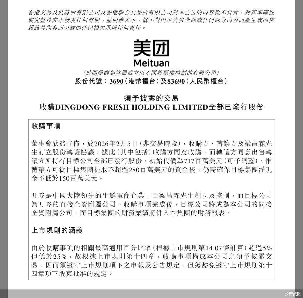美团零售版图再扩大。根据美团发布的公告,公司高度重视即时零售业务,本次收购将有助于充分发挥双方在商品力、技术、运营等方面的优势,为消费者提供更优质的消费和配送体验。公开资料显示,截至2025年9月,叮咚买菜月购买用户数超过700万。