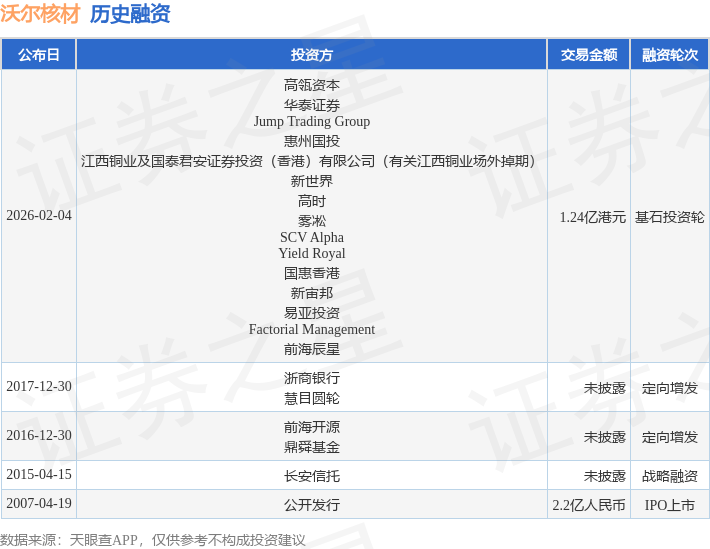 证券之星消息,根据天眼查APP于2月4日公布的信息整理,深圳市沃尔核材股份有限公司基石投资轮融资,融资额1.24亿港元,参与投资的机构包括高瓴资本,华泰证券,Jump Trading Group,惠州国投,江西铜业及国泰君安证券投资(香港)有限公司(有关江西铜业场外掉期),新世界,高时,雾凇,SCV Alpha,Yield Royal,国惠香港,新宙邦,易亚投资,Factorial Management,前海辰星。