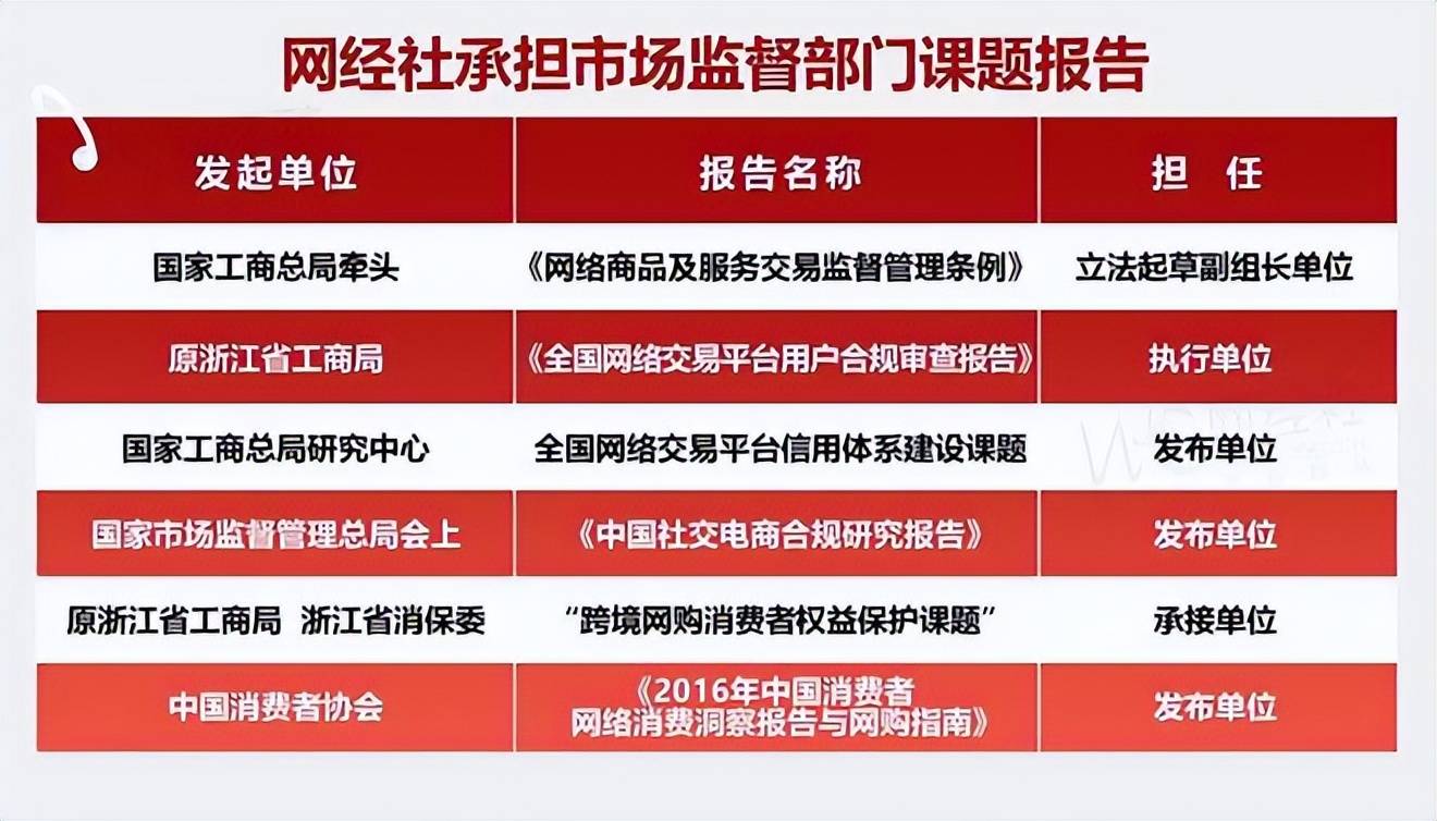 此前,网经社在消费维权、立法等方面也取得不少成果,并得到有关部委、消协的肯定。如2020年网经社出席国家市监督总局在京召开的“互联网企业创建无传销网络平台座谈会”,发布国内首份《中国社交电商合规研究报告》;2017年承接浙江省工商局、浙江省消保委委托的“跨境网购消费者权益保护课题”;2016年承担承接国家工商总局和浙江省工商局“全国网络交易平台合规审查”调研课题项目;在国家工商行政管理总局消费者权益保护局、中国消费者协会指导,与《中国消费者报》举办的“促进电商发展指导网络消费”座谈会上,发布《2016年中国消费者网络消费洞察报告与网购指南》。2024年9月25日,浙江省消保委第四届专业委员会专家聘任仪式暨浙江《消法》实施办法修改座谈会在浙江省市场监督管理局举行。网经社电子商务研究中心主任曹磊受邀参加,并获聘浙江省消保委第四届电子商务专业委员会专家。