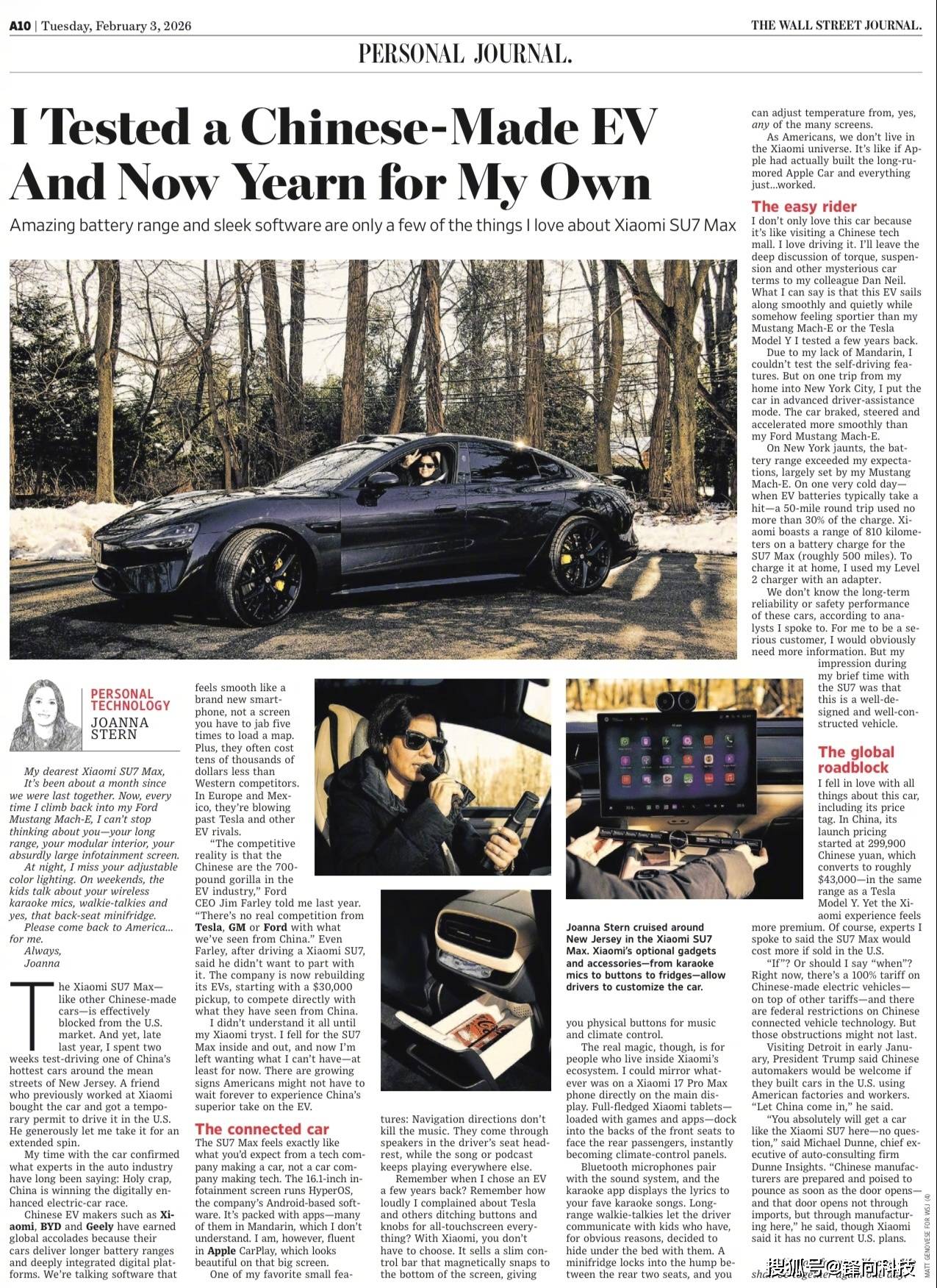 这不全球权威媒体之一的《华尔街日报》在上周就报道小米SU7。这是他们科技专栏作家“Joanna Sterm”找朋友借了一辆小米SU7 Max版本,且亲自试驾了两周的时间。试驾完之后写下了这篇报道,报道是以“我试驾了一辆中国电动车,现在我再也不想买美国车了”的,上图就是原文大家可以自己看看。在文她写道:所以你懂的,我爱上了这辆车的一切,包括它的价格。在中国,它的上市起售价为 299,900 元人民币,折合大约 43,000 美元——与特斯拉 Model Y 处于同一价格区间。但小米的整体体验感觉更为高端。当然,我采访的专家表示,如果在美国销售,SU7 Max 的售价会更高。