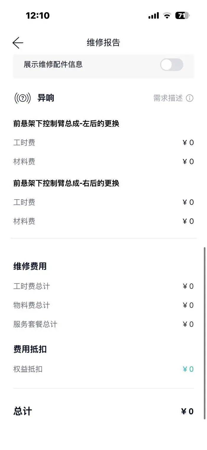 最让康先生无法理解的是今年1月出现的问题。康先生描述,自己的车出现了和2024年刚提车不久时的同样问题,他再次把车交给售后。这次售后记录显示,前悬架下控制臂总成左右后部位都进行了更换,这意味着维修从换一个套件,变成了整个总成的更换,距离第一次维修仅一年多后,车子的前悬架下控制臂又出现异常。