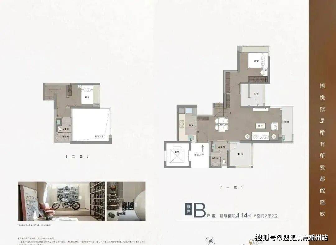 114㎡复式户型看上去就实用很多,因为项目是2018年报建的,那时还没禁复式令,所以耀胜尊府这个是真复式,得房率非常高。
