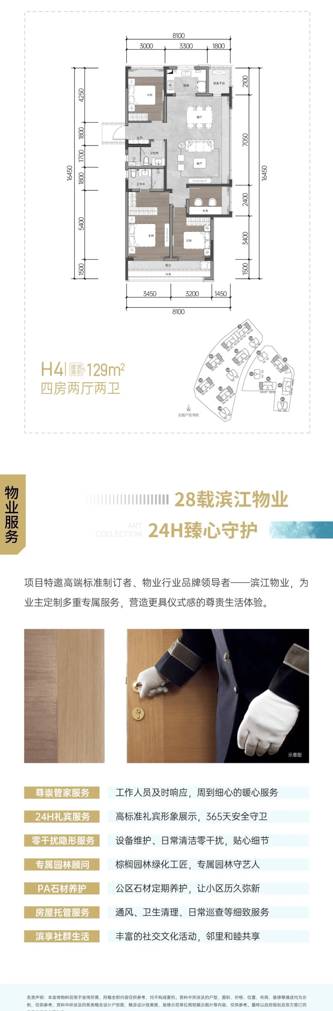 项目特邀高端标准制订者、物业行业品牌领导者 —— 滨江物业,为业主定制多重专属服务,营造尊贵生活体验。包括尊崇管家服务、24H 礼宾服务、零干扰隐形服务、专属园林顾问、PA 石材养护、房屋托管服务以及丰富的滨江社群生活。