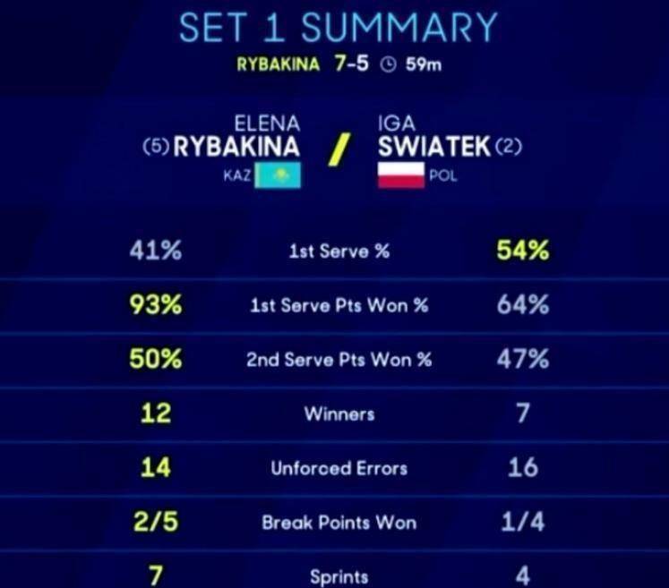 随后的比赛中,莱巴金娜的一发得分率飙升至93%,而斯瓦泰克仅64%。 第12局,斯瓦泰克在非保不可的发球局中出现关键分失误,莱巴金娜凭借一记反手直线兑现盘点,以7-5先下一城。
