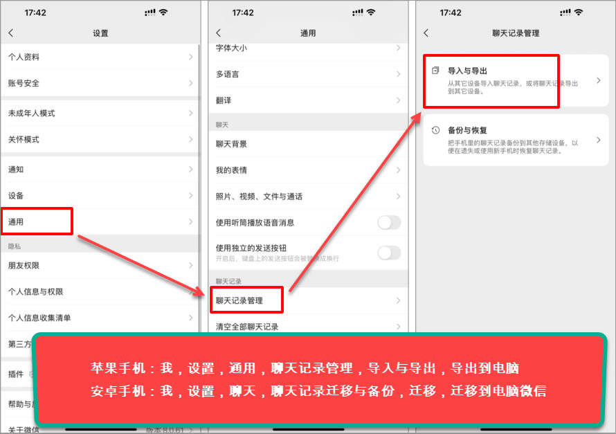 1,如果微信语音消息在手机微信上,则第一步需要将手机上聊天内容全部迁移(或导出)到电脑微信上。方法为手机与电脑连接相同WIFI,然后在手机微信中进入设置,通用(或聊天),然后按提示信息将记录迁移或导出到电脑微信上,注意,安卓手机与苹果手机的操作界面会有所不同,可查看下图中的文字说明。