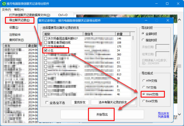 5,进入导出聊天记录窗口,选择将记录导出为WORD文档或TXT文档。
