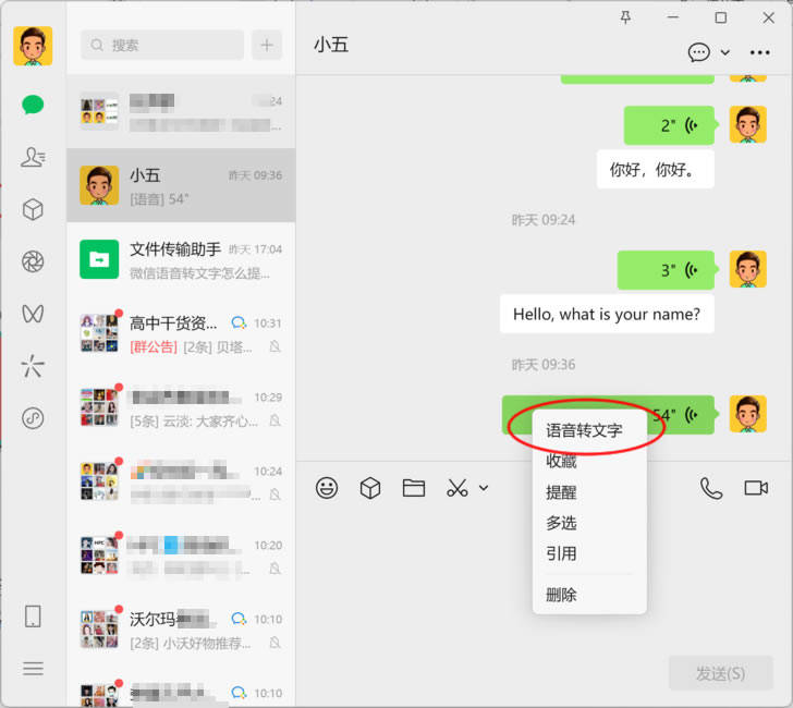 2,在电脑微信上右击微信语音消息,点击“语音转文字”菜单将其转换为文字。