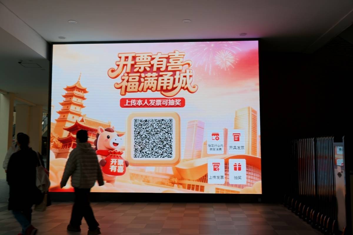 商场内,不少商户将活动标识贴在显眼位置,店员主动向顾客介绍福利,消费者逛着年货摊,手里攥着刚开具的电子发票,迫不及待地掏出手机上传,期待解锁惊喜。
