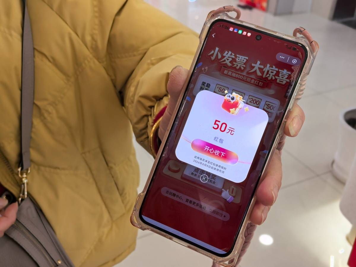 一家人消费400多元,在店员的细致指导下上传发票,10元红包稳稳到账。“平时抽奖从来没中过,就想试试手气,没想到真有惊喜!”陈俭笑着说,打算用这笔“意外之财”给孩子买杯奶茶。