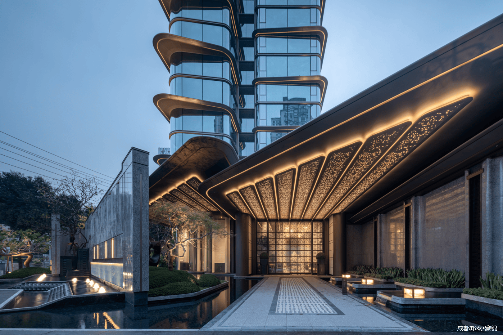 特选红果冬青、奢石及流瀑水景点缀于背景及两侧,构筑酒店式落客尊仪。