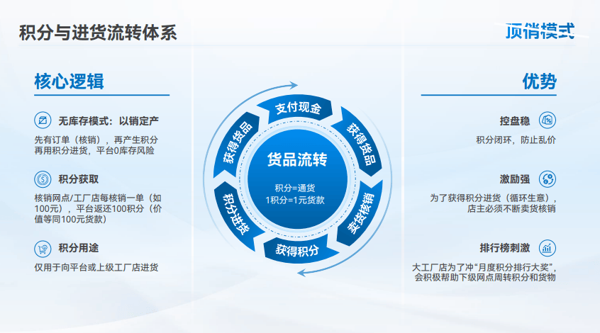 这套模型的转变:shou次投入后,后续补货用"销售积分"兑换。