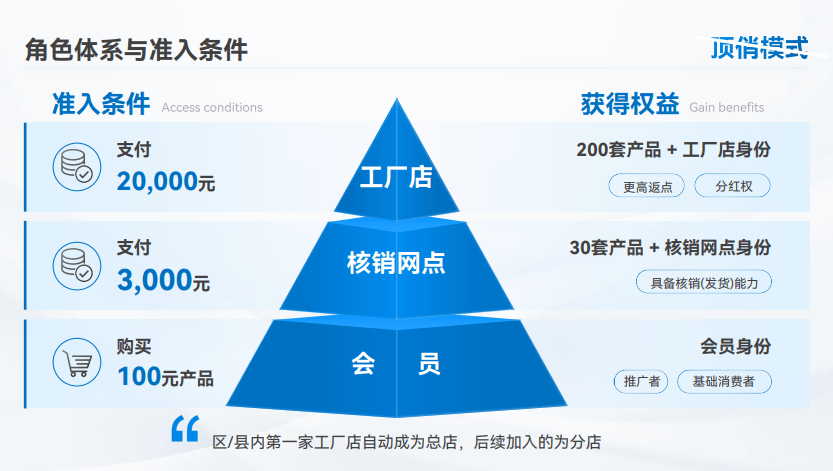 模型设置了三层角色:消费者(会员)→ 核销网点 → 工厂店(区域合伙人)。每一层有明确的准入门槛和权益升级路径: