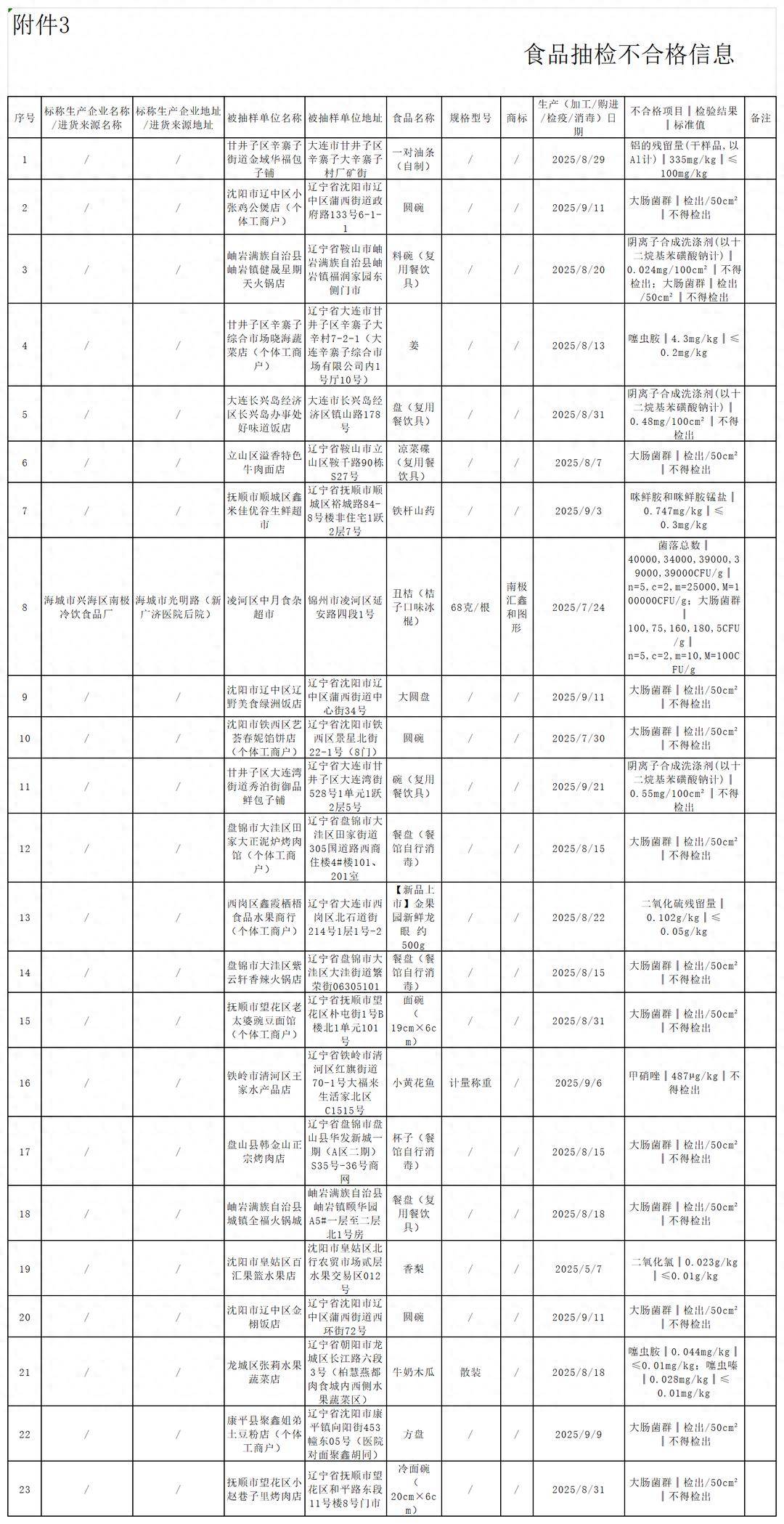 沈阳市辽中区小张鸡公煲店、岫岩满族自治县岫岩镇健晟星期天火锅店、大连长兴岛经济区长兴岛办事处好味道饭店、鞍山市立山区溢香特色牛肉面店、沈阳市辽中区辽野美食绿洲饭店等餐饮店使用的圆碗、料碗、盘、凉菜碟、大圆盘等餐饮具不合格,不合格原因是检出了大肠菌群、阴离子合成洗涤剂。