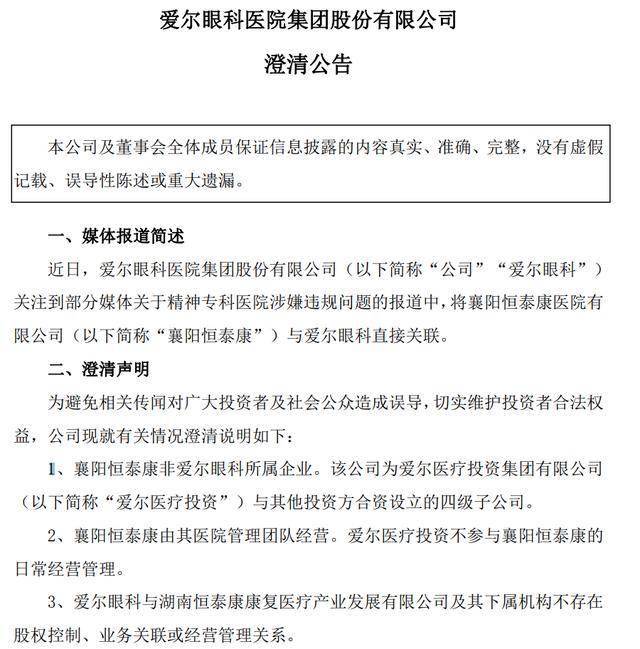 针对此事,爱尔眼科在短时间内发布公告撇清了关系,称涉事的这家襄阳恒泰康医院非爱尔眼科所属企业,为爱尔医疗投资与其他投资方合资设立的四级子公司。