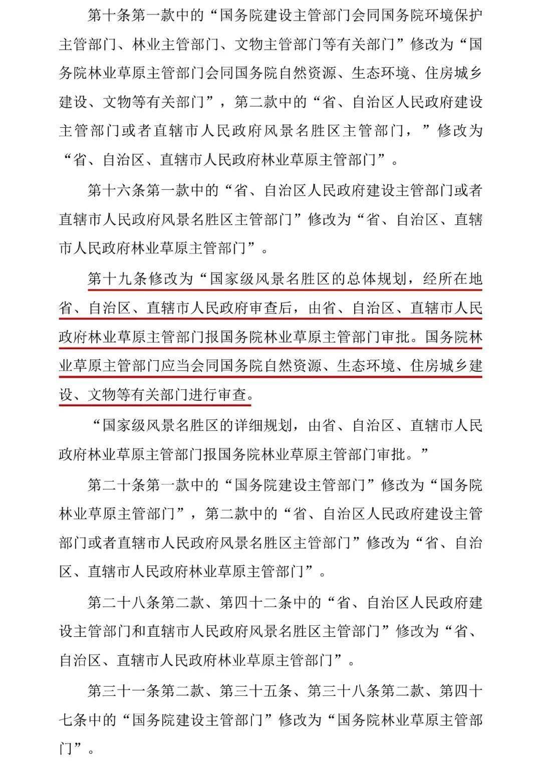 修改后的《风景名胜区条例》明确规定,风景名胜区的总体规划由国务院林业草原主管部门审批,并会同自然资源、生态环境、住房城乡建设、文物等有关部门审查。