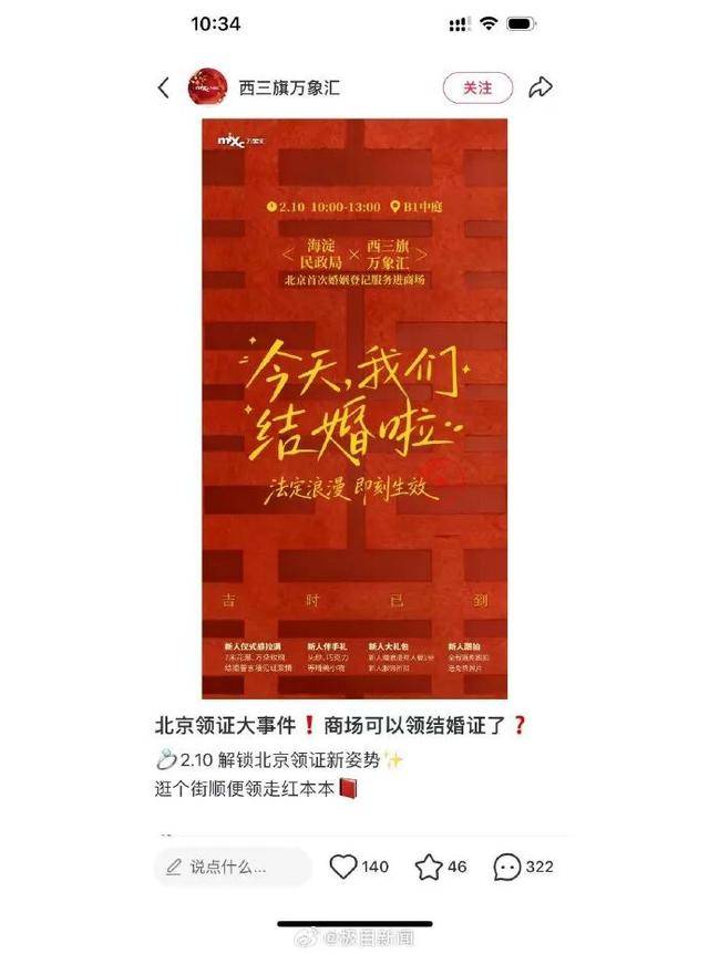商场也能领结婚证了?近日,有网友发帖称,2月10日可在北京西三旗万象汇商场内登记结婚,新人可在7米花瀑、万朵玫瑰誓言墙前打卡留念,并享受多项福利。据极目新闻,记者从商场方面获悉,该活动名额有限需提前预约,现基本已经报满。