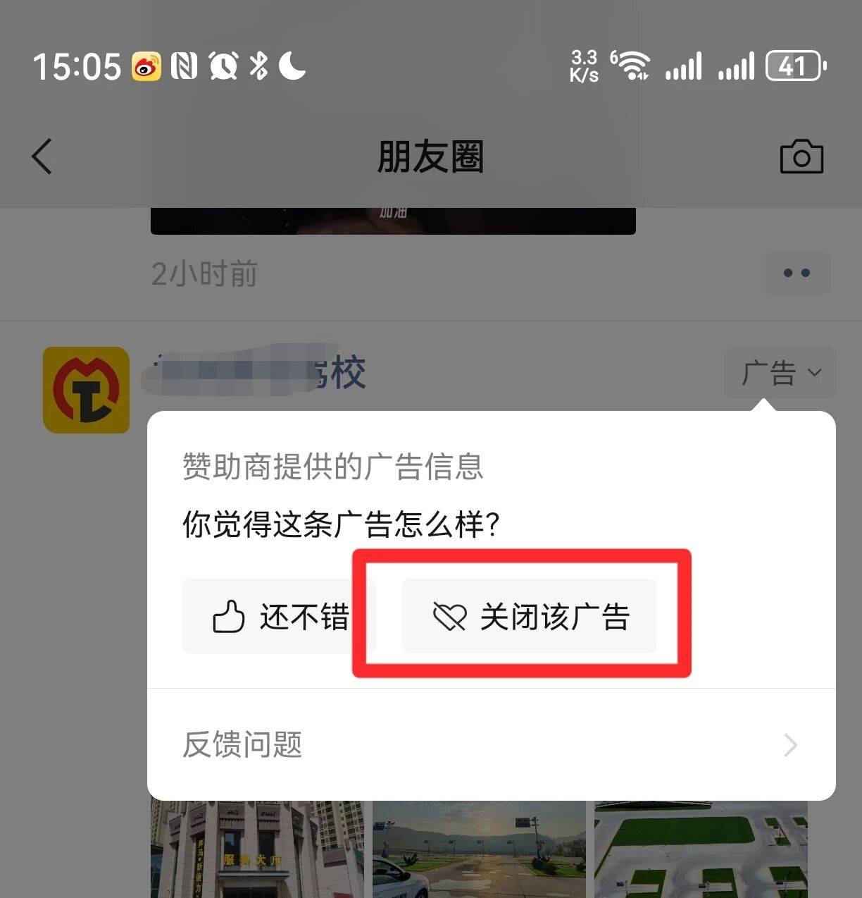 接下来,微信会让你选择一个关闭该广告的原因,直接点击直接关闭的选项,这个广告就从你的朋友圈中消失了。