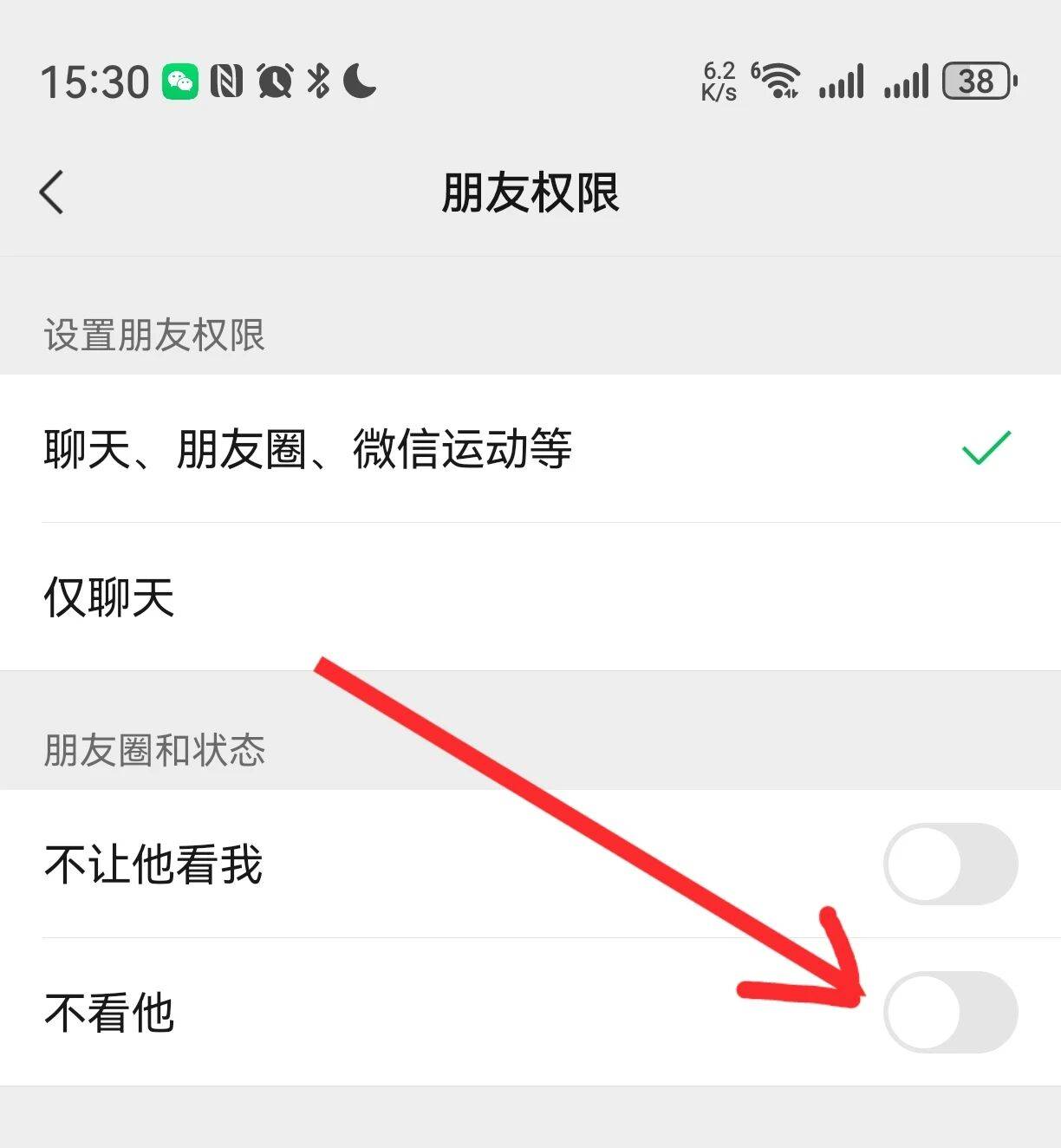 进入之后,可以对微信好友的权限进行设置。这里有2个分类,一是设置朋友圈的权限,二是朋友圈和状态。