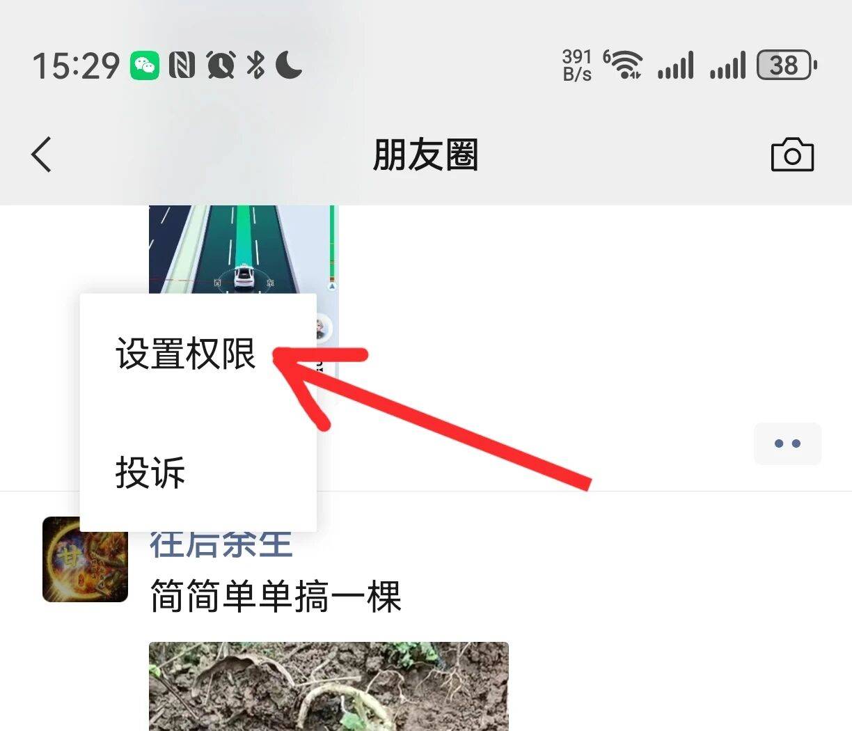 在想要删除朋友圈的微信好友头像上面长按2秒,会弹出一个菜单,从这里选择【设置权限】的选项。