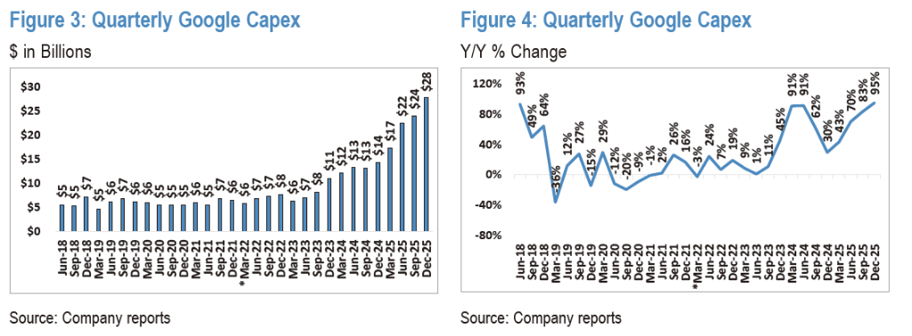 2026年,谷歌的资本支出指引已上调至1750亿至1850亿美元,同比增速高达97%,其资金正疯狂涌向服务器和技术基础设施。