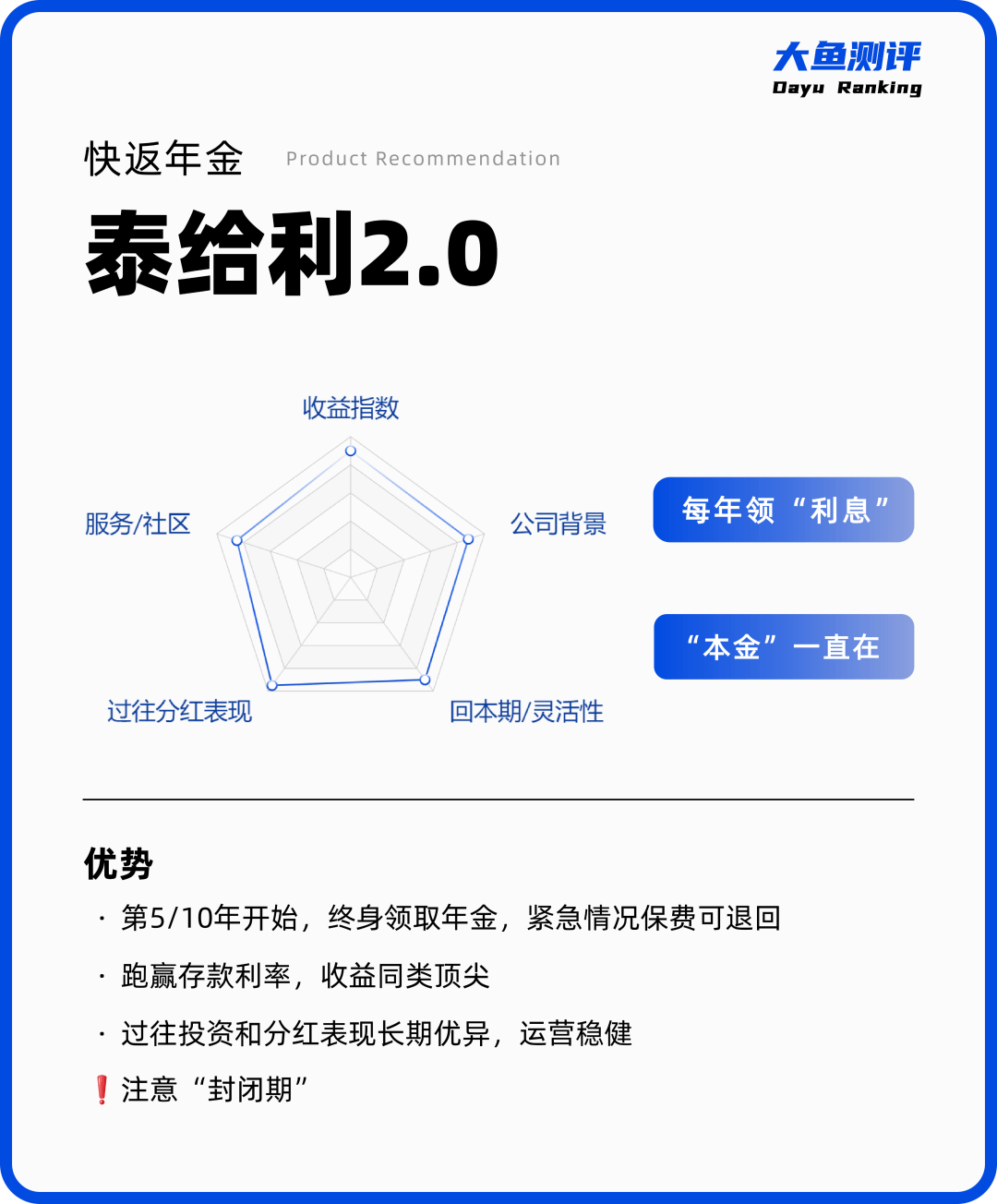 注意:前几年总体利益少于已交保费,短期要用的资金不适合投入;泰给利2.0红利仅支持现金领取、累积生息和已交保费,如果希望越领越多,可以考虑其他快返年金。