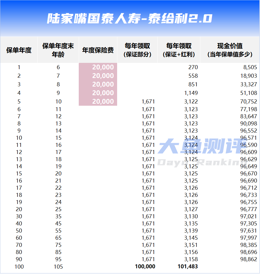 父母给5岁孩女宝投保,每年交2万,交5年,第1年末就能领到现金红利,可以给孩子买书、玩具作为新年礼物;第5年起开始领取保证的年金,若分红100%实现,每年领取3100+直至105岁。