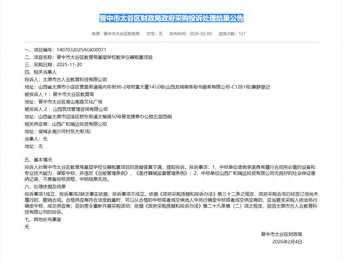 2026年2月4日,山西省政府采购网发布晋中市太谷区财政局政府采购投诉处理结果公告,对太原市古人云教育科技有限公司就“晋中市太谷区教育局基层学校教学仪器购置项目”提起的投诉给出定论。