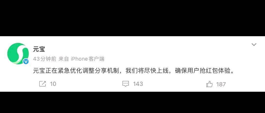 针对微信的处置,元宝官方微博随后回应称,团队正在紧急优化调整分享机制,将尽快上线新版本,确保用户抢红包的体验不受影响。作为腾讯旗下的AI应用,元宝此次春节红包活动本是平台拉新促活的重要动作,却因分享规则过于激进引发用户反感,最终被自家生态"叫停"。