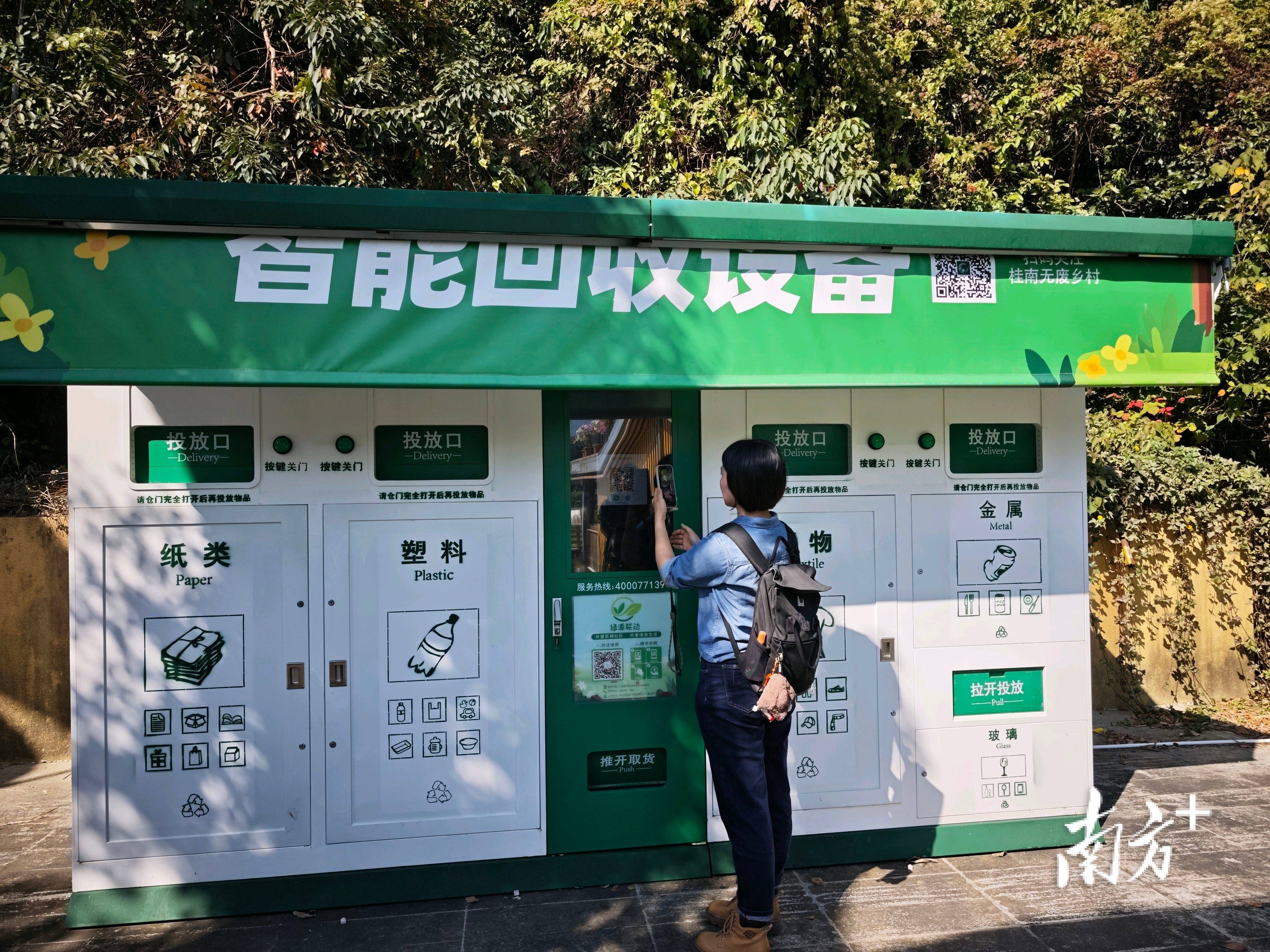 人们通过将废纸、饮料瓶等可回收物投进智能回收设备,既能减少家庭垃圾,用实际行动践行低碳生活,也能通过积分,在桂南村部分餐馆、咖啡店消费时直接用于抵扣。