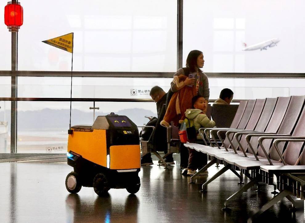 ▲美团“小黄蜂”上岗南京机场,旅客在登机口也能“点外卖”(管乐 摄)
