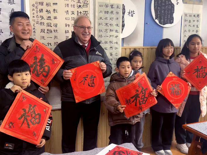 在三峡大学任教多年的托马斯·拉姆齐(Thomas Ramsey)正在与孩子们写“福”字,准备自己在宜昌的第16个春节。 (张泽牧 朱芸乐 摄)
