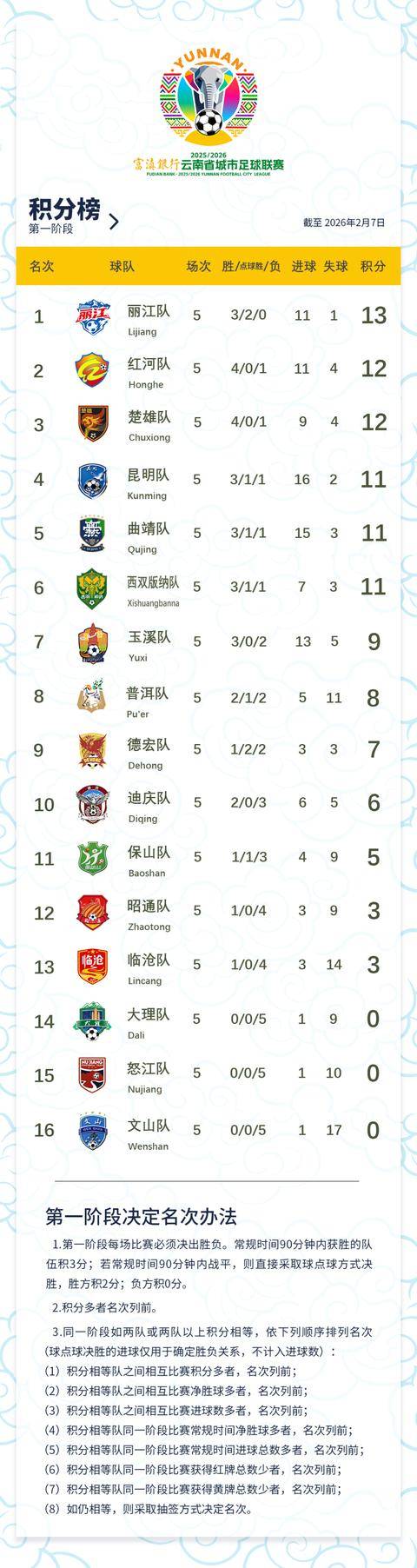 焦点大战中,丽江主场迎战曲靖,双方90分钟内1-1战平,丽江凭借点球大战5罚全中的完美表现击败曲靖,凭借此役收获的2个积分,结合楚雄本轮客场告负,以13分登顶积分榜。而迪庆主场2-1力克此前领跑积分榜的楚雄,终止对手四连胜的同时斩获两连胜,进一步搅乱积分榜格局。