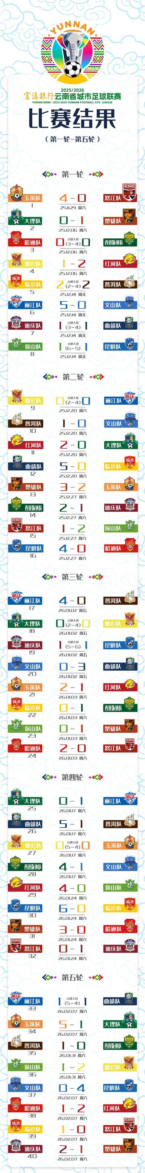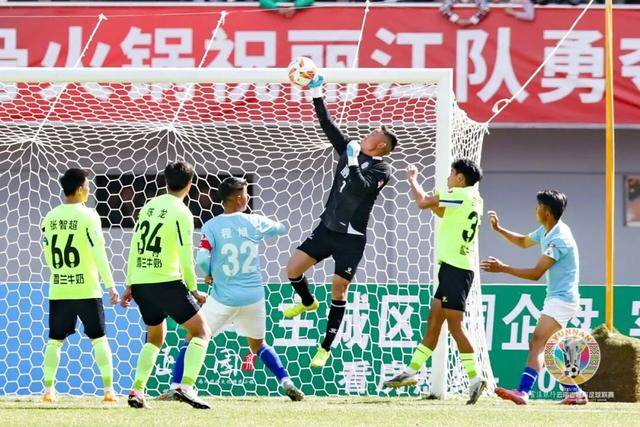 丽江1-1曲靖(点球5-4)。在第五轮的焦点大战中,此前积分榜排名第三的丽江队坐镇主场迎来排名第二的曲靖队的挑战,比赛开始,两队均展现出极佳的竞技状态,展开对攻战。第43分钟,丽江队开出角球在对手禁区内制造混乱,皮球击中立柱后弹出,曲靖队34号陈龙不慎自摆乌龙,丽江队1-0领先结束上半场;下半场刚开始,曲靖队右路策动进攻将球传入禁区,刚刚被替换上场的49号和春星后点垫射破门扳平比分,同时打破了丽江队的0失球金身。随后的比赛中,双方均未能继续改写比分,90分钟内战至1-1,比赛被拖入点球大战。点球大战中,丽江队顶住压力5罚5中,最终以5-4战胜曲靖队艰难取得2个积分。由于本轮楚雄队客场告负,丽江队也凭借本场比赛的胜利积13分登顶积分榜。