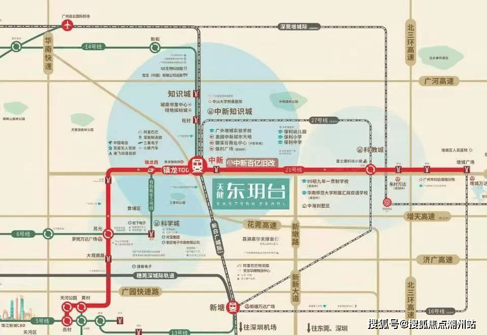 项目交通:地铁——直线距离广州地铁21号线中新地铁站800米左右,1站到镇龙站(14号线),2站科学城,3站到天河;21号线直达员村、14号线串联知识城、27号线直达新塘交通枢纽(规划);城轨有新白广城轨(镇龙站到广州白云机场、深圳机场);莞深-新白广城际穿梭大湾区核心城市(北至广州北站、白云机场,南达东莞虎门火车站、深圳宝安机场,西连佛山西站、广州东站等);