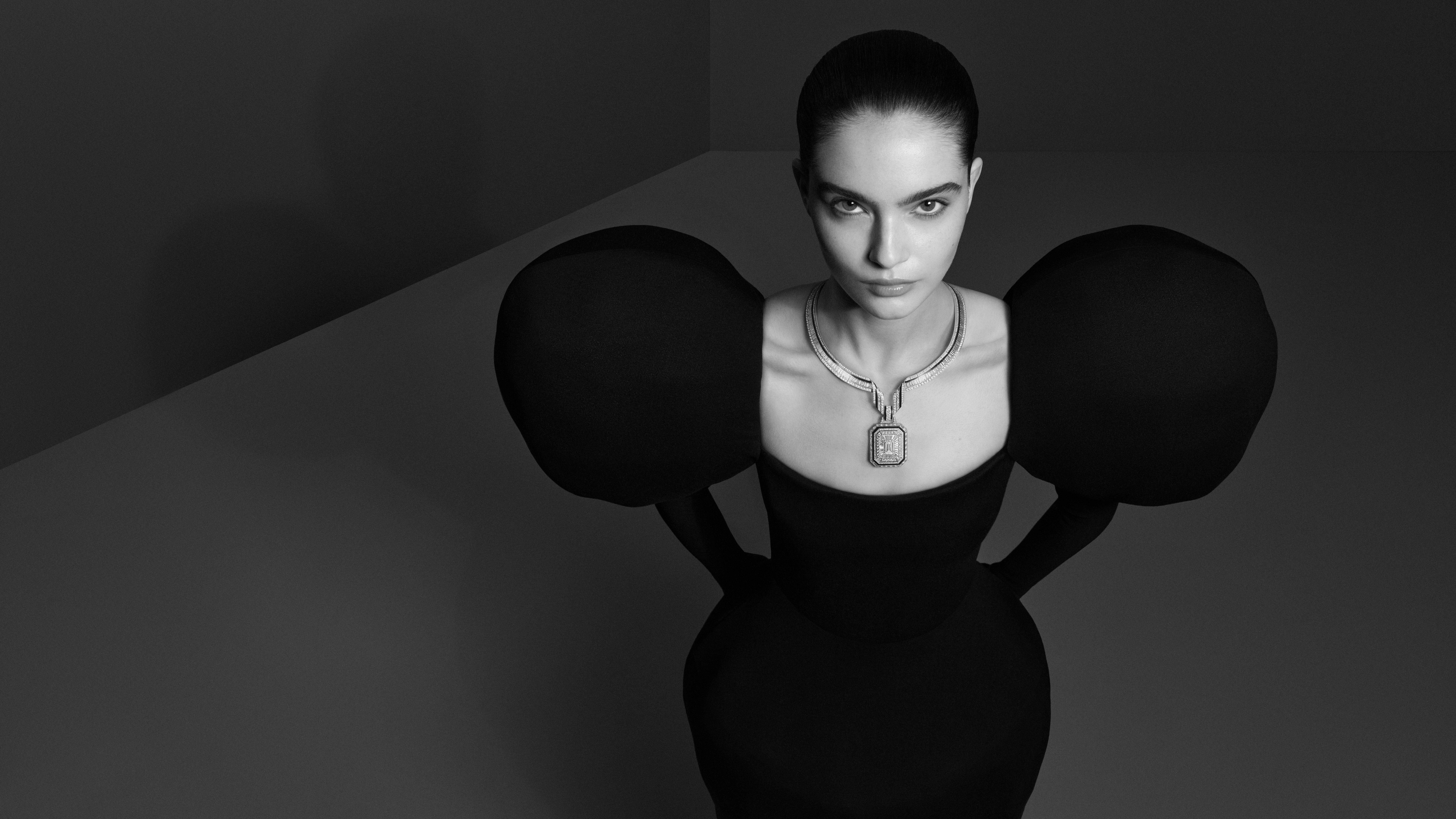 1893年,菲德烈克凭着直觉的敏锐,选定了广场26号的Nocé公馆。当同行们还在追逐名流的裙摆时,他却在追逐阳光——因为这里是广场全天采光最佳的角落。全新系列中的“The Address”项链,便是对这一极具前瞻性决策的建筑化凝视。那颗重达10.01克拉的祖母绿形切割钻石,仿佛一面“镜中镜”,在黑漆与白金构建的几何迷宫中,折射出芳登广场八边形的轮廓。这件耗时1107小时的臻品,精妙之处不只在于宝石的堆砌,更在于结构与身体的博弈:坚硬的几何线条经过精密铰接,竟能如丝缎般服帖于颈间。