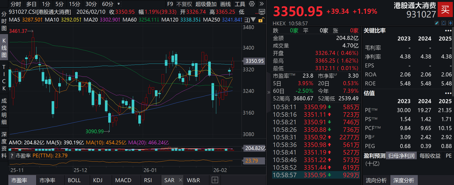 截至2026年2月10日 10:56,港股通大消费指数(931027)强势上涨1.28%,成分股石药集团(01093)上涨7.67%,科伦博泰生物-B(06990)上涨6.39%,信达生物(01801)上涨5.97%,药明生物(02269),康方生物(09926)等个股跟涨。