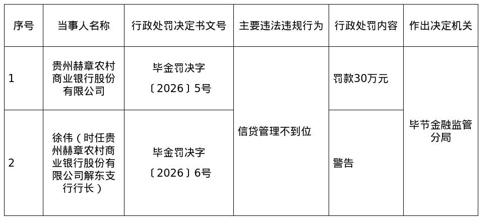 罚单显示,贵州赫章农村商业银行股份有限公司的主要违法违规事实(案由)为:信贷管理不到位。