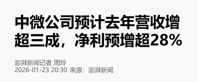 中微公司 2026 年 1 月 23 日披露的业绩预告显示,2025 年营收同比增长 36.62%,净利增长 28.74% 至 34.93%。