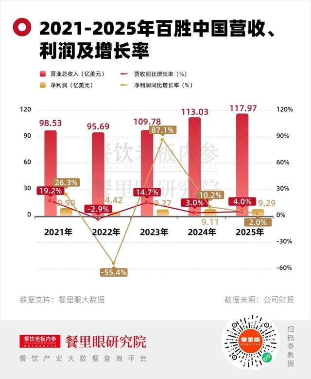 餐饮不断承压下,2025年百胜中国迎来了整体规模、同店销售与盈利能力的同步增长。回看其近五年品牌的业绩表现,在2022年的波动之后,一直是稳健增长。