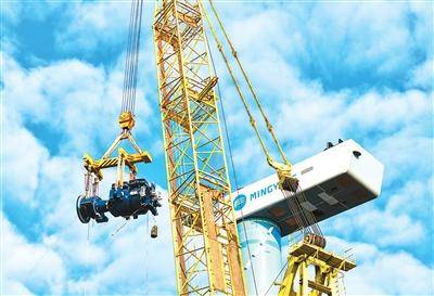 在湖南省衡山县,投资1.6亿元、总装机容量25兆瓦的长江风电场正在建设中。图为项目部施工人员进行齿轮箱的吊装工作。曹正平摄(人民视觉)