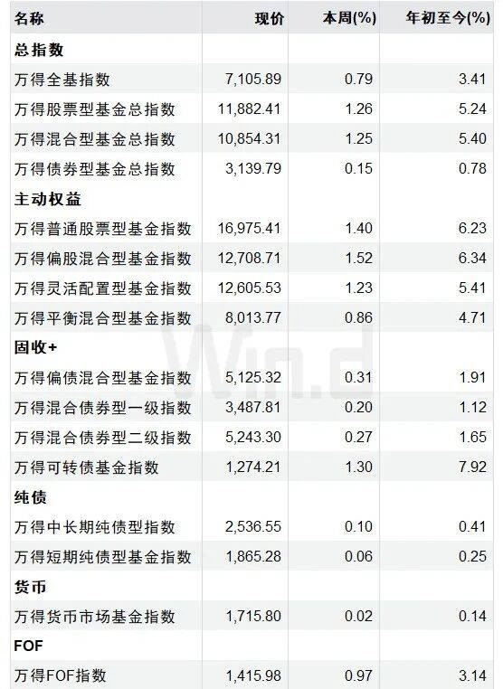 节前一周,万得基金指数整体表现平稳。具体来看:万得全基指数上涨0.79%;万得股票型基金总指数上涨1.26%;万得混合型基金总指数上涨1.25%;万得普通股票型基金指数上涨1.40%;万得偏股混合型基金指数上涨1.52%;万得灵活配置型基金指数上涨1.23%。